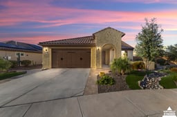 Enjoy beautiful mountain view sunsets from your front travertine courtyard and the spacious privacy of an oversized masonry walled backyard! This 2-bed, 2-bath, plus den Sanctuary floor plan offers a bright and contemporary interior. The kitchen features Regal white cabinets with soft-close door and drawers and pullout trays in the lower cabinets, white quartz countertop and subway tile backsplash, with upgraded KitchenAid appliances including a gas cooktop. Upgraded luxury vinyl plank flooring with carpeted Great Room and bedrooms and easy-to-clean cultured marble surrounds in both showers. The garage features a four-foot extension and epoxy coated floors. The best feature is the HUGE private, north-facing backyard with oversized travertine patio and large synthetic turf area
